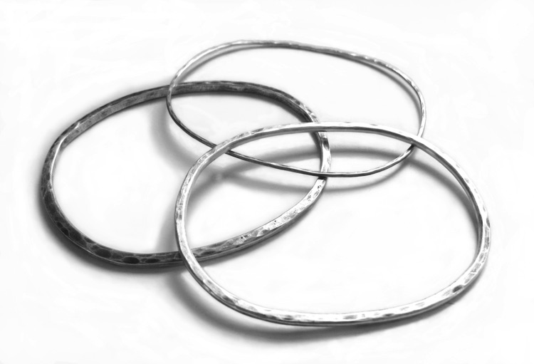OAK $140, $150, $160-sterling silver bangle bracelet of rounded rectangle with hammered surface and sanded edges (1/16-1/8" thick)